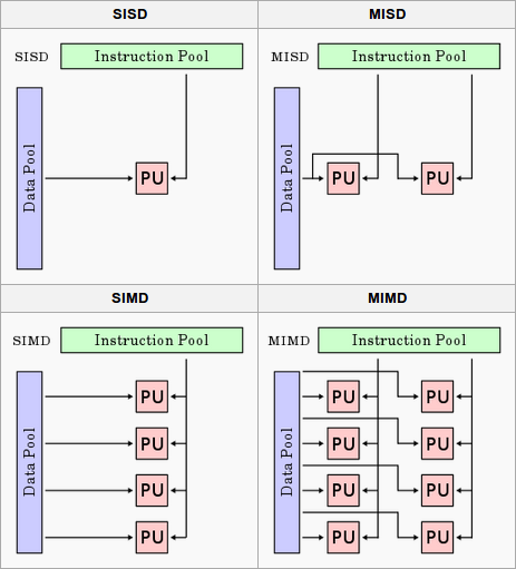 Flynn’s taxonomy classifies hardware architectures by instruction and data streams. I.e. a single-core CPU is SISD (Single Instruction, Single Data), while multi-core CPUs operate as MIMD (Multiple Instruction, Multiple Data) where each core independently executes different instructions on different data. SIMD (Single Instruction, Multiple Data) extends a single core with vector units (e.g. SSE, AVX) that apply one instruction to multiple data elements simultaneously. GPUs take this further with SIMT, essentially SIMD combined with multithreading, where groups of threads (warps-CUDA, wavefronts-AMD) execute the same instruction in lockstep on different data.